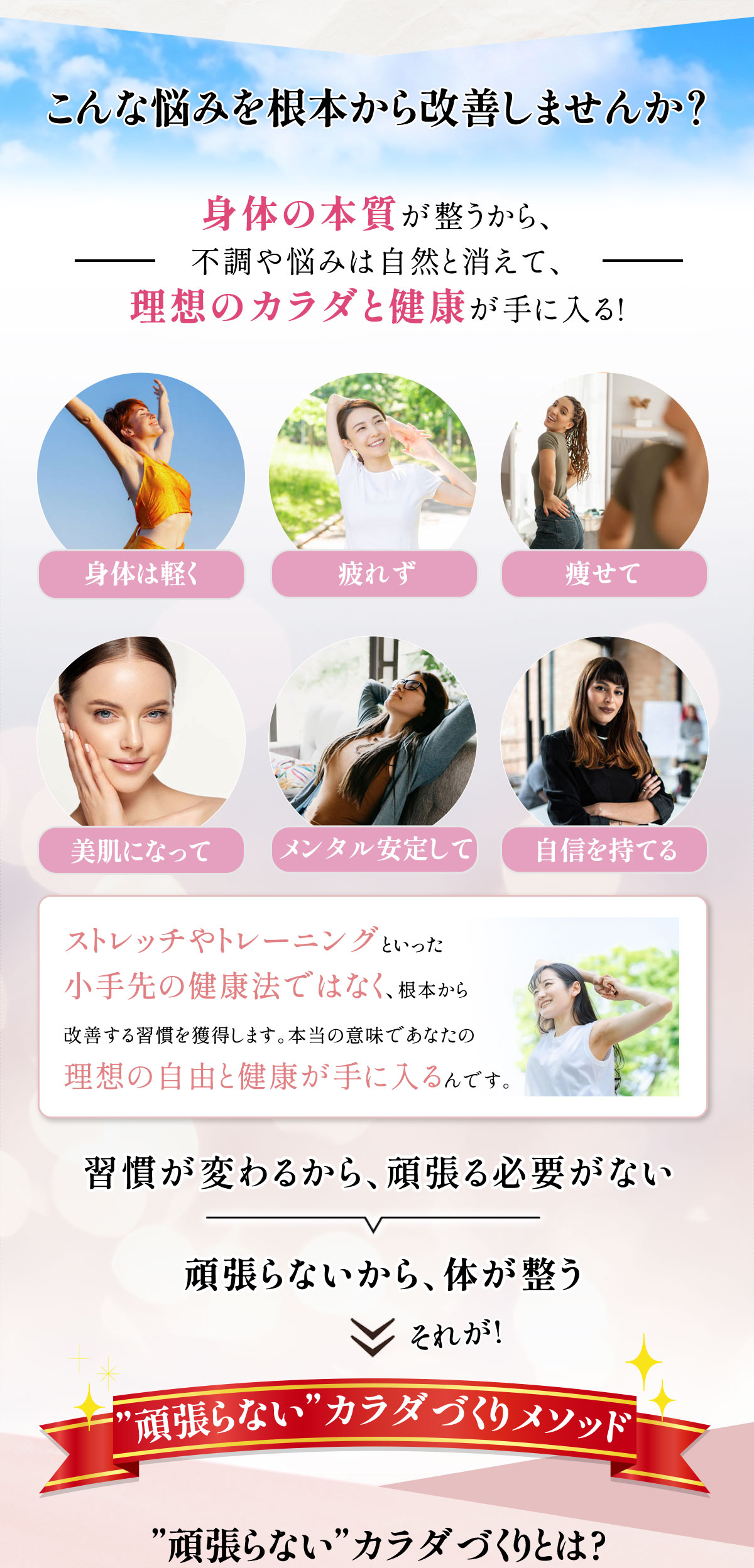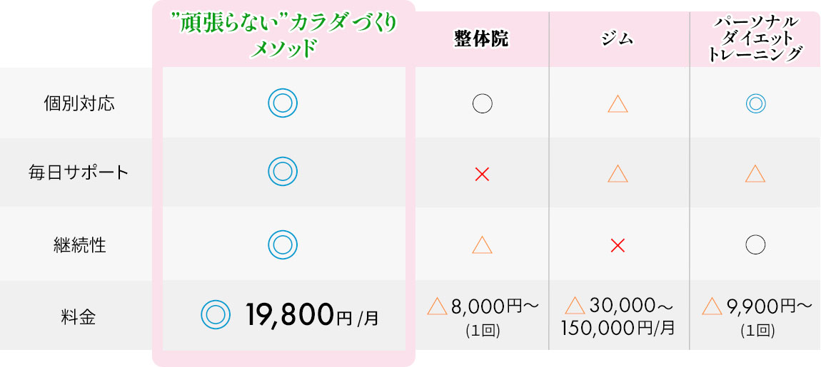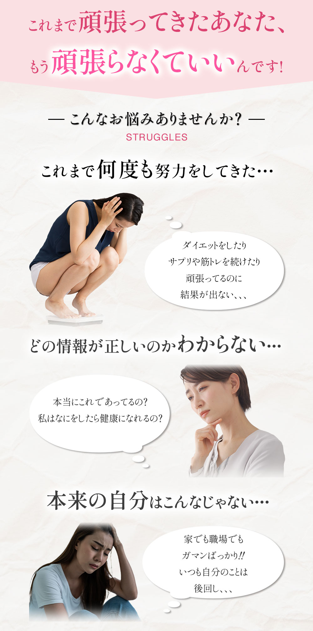 あなたに実践していただくのは、辛いトレーニングでも無理な食事制限でもなく、身体の本質を整えることです。これは生活と習慣の見直しで整えることができます。少しずつあなたの習慣づくりをサポートするため、辛い思いや不安を感じることがありません。だから続けられるんです。