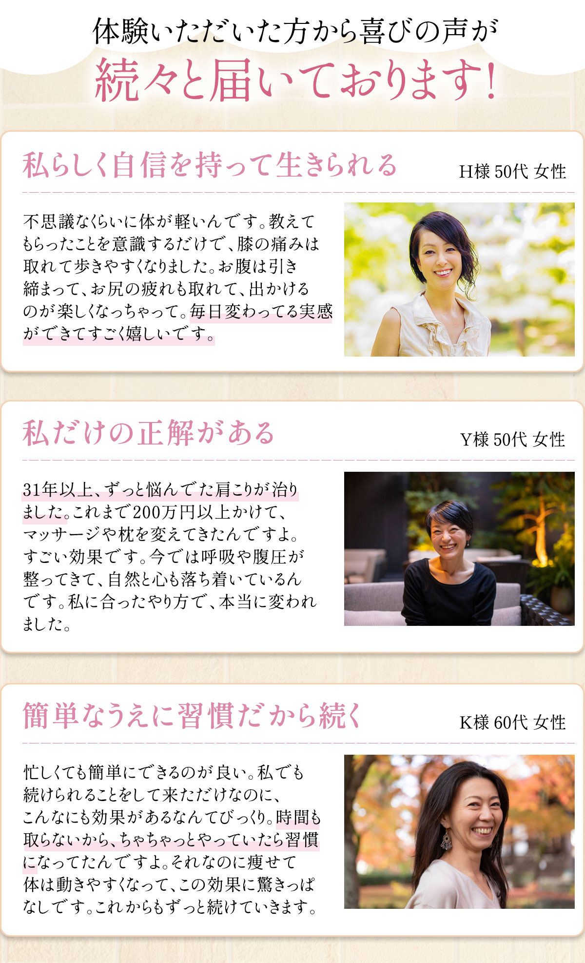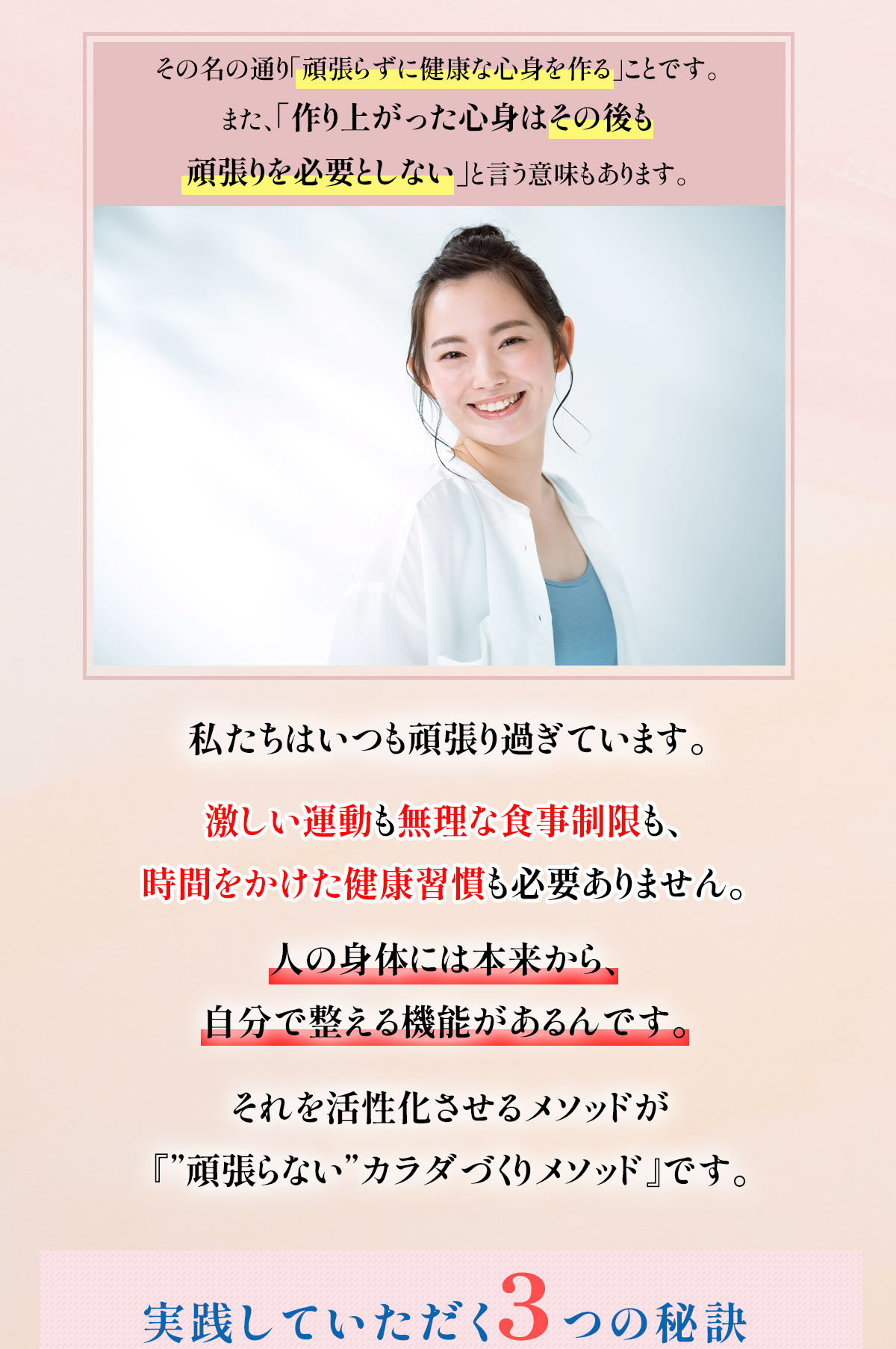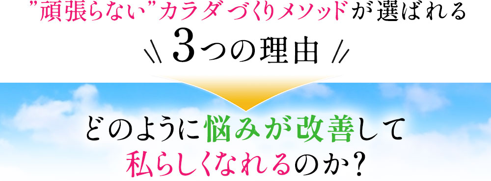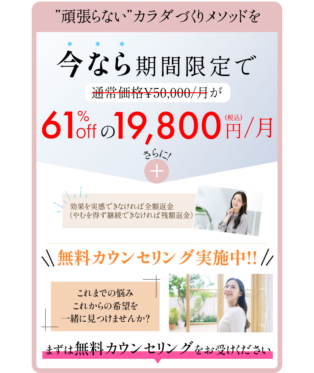 あなたに実践していただくのは、辛いトレーニングでも無理な食事制限でもなく、身体の本質を整えることです。これは生活と習慣の見直しで整えることができます。少しずつあなたの習慣づくりをサポートするため、辛い思いや不安を感じることがありません。だから続けられるんです。