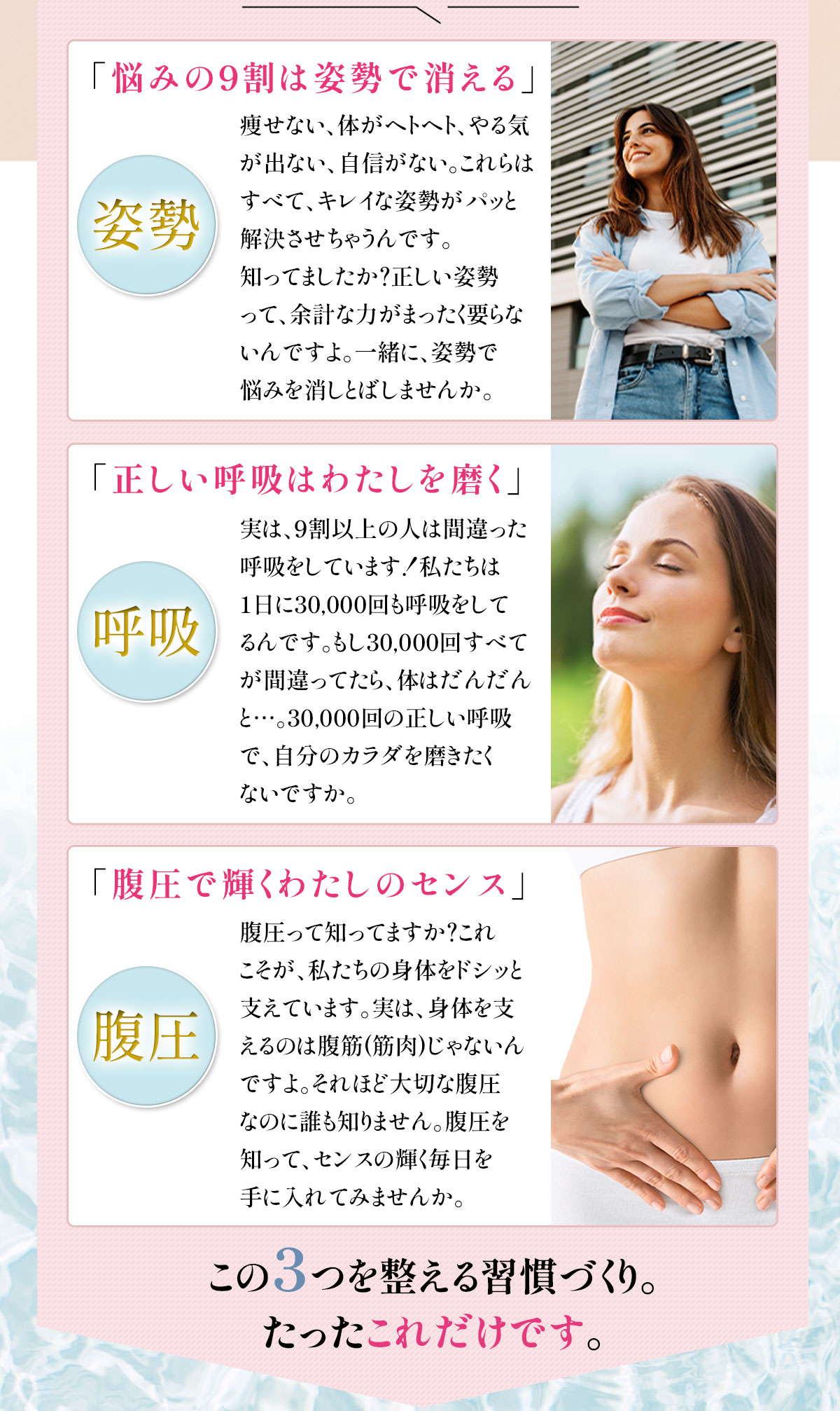 カラダの本質とは、身体本来の働きや性質のことです。人の身体は自然と修復して元に戻ろうとする働きがあります。その働きを活性化させるのが「姿勢、呼吸、腹圧」の3つ。実践していただくのは、この3つを整える習慣づくりです。これらを意識することで、ダイエットやスキンケアではできない、本質的な健康が手に入ります。本来の働きが整うから、あなたの人生をより輝かせてくれます。